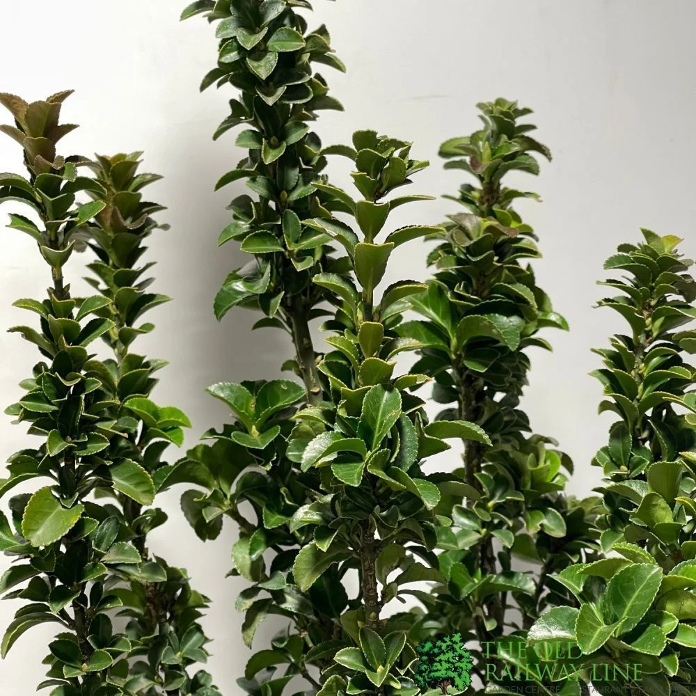 Euonymus Japonicus ‘Benkomasaki’, sometimes known as the ‘Japanese Spindle Tree’ has a very upright habit, even for an Euonymous. It shows a brilliant display of gloss green foliage standing tall making this a great specimen plant. Its leaves appear regimented and organised, spreading in a symmetrical pattern from the base of the plant to the tips. Its considered a hardy plantand tolerant of some levels of shade.
